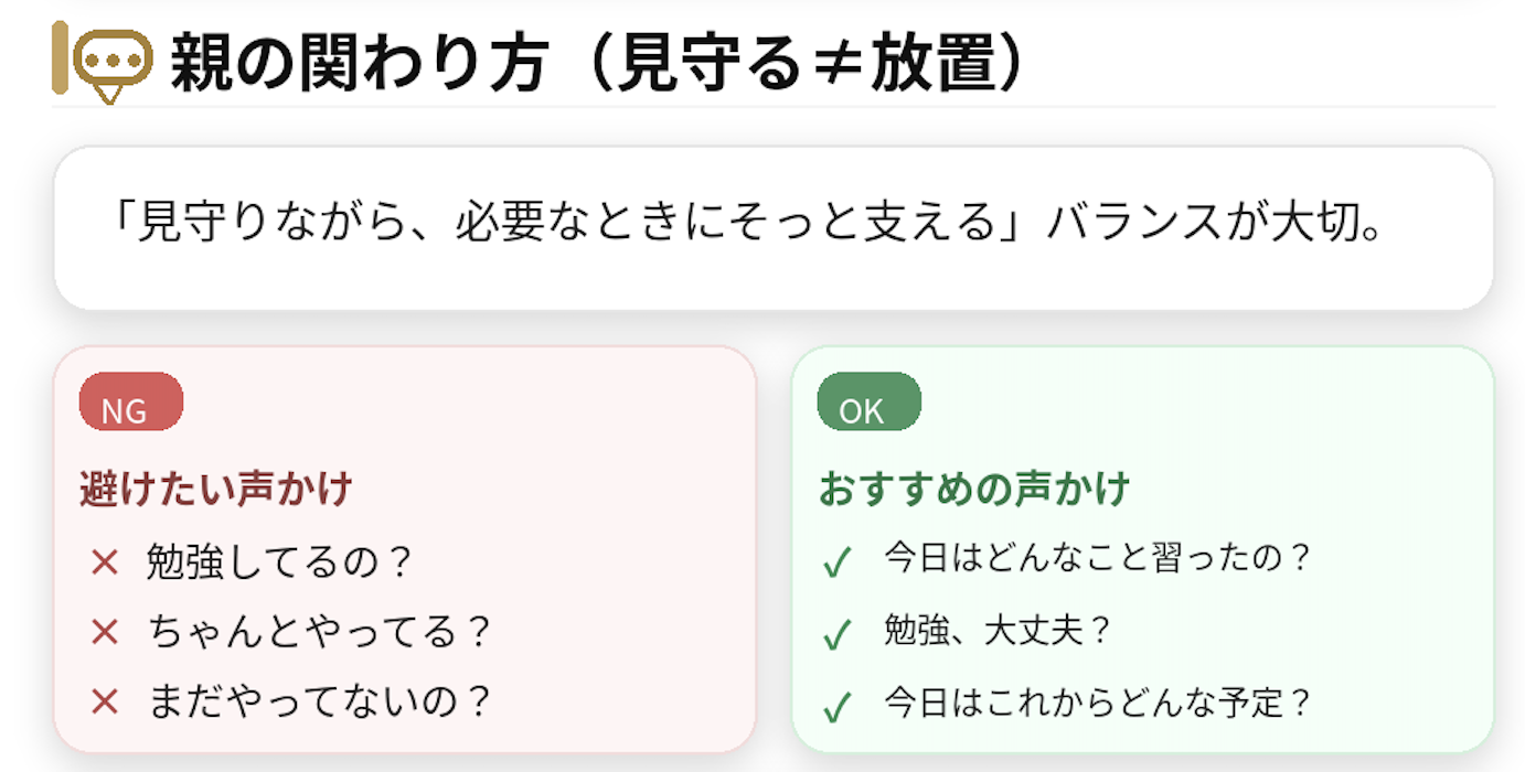 → 関心を示しながらも、子ども自身に考えさせる問いかけが効果的です。